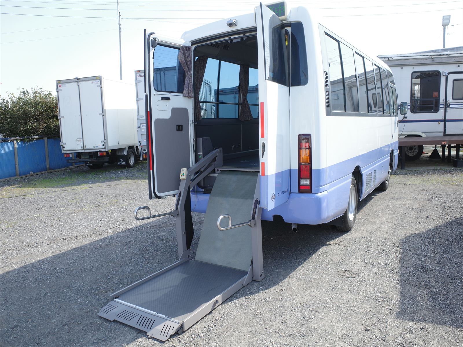 | 車種 | シビリアン 10人乗り 車両総重量4390Kg 8ナンバー登録 車いす移動車 旧オートマ限定普通免許で運転OK |